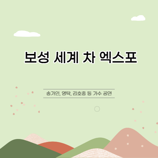 보성 세계 차 엑스포가 제11회를 맞았습니다. 처음 수확한 찻잎은 어린잎이라 굉장히 맛있죠! 이 시기에 보성에서는 우리나라 최대 규모의 녹차 축제인 보성 차 축제를 합니다. 송가인과 영탁, 김호중이 초대가수로 와서 공연하고, 공군 특수비행팀의 에어쇼까지 볼 수 있는 보성 차 엑스포! 오늘 프로그램부터 가는 길, 주차장 정보와 BHC 뿌링클 치킨세트 등을 받을 수 있는 경품 받는 이벤트까지 모두 알려드릴게요!